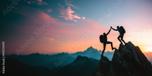 Two hikers high-fiving on a mountaintop at sunset, representing teamwork, friendship, and shared accomplishment in a serene, mountainous landscape with a colorful sky