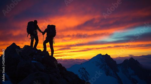 Two hikers, one helping the other reach the summit of a mountain. Silhouetted against a vibrant sky, emphasizing camaraderie and support. Rugged terrain, sense of accomplishment and adventure