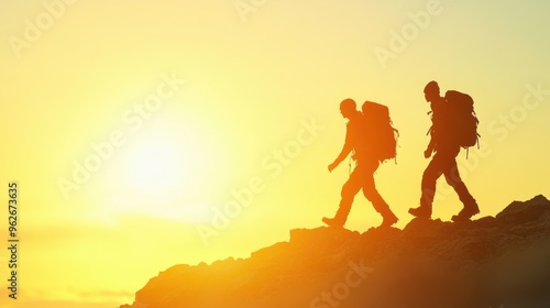 Two hikers silhouette against a stunning sunrise, celebrating their achievement at the mountain summit, filled with tranquility and awe