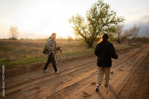Two hikers stand on a sandy road, ready to explore the natural beauty of the area during early evening hours