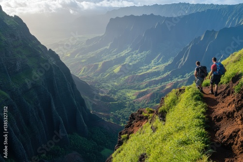 Two Hikers Trek Through Mountain Terrain with Scenic Valley Views