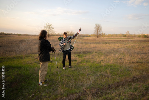 Two hikers walk along a dirt path in a nature field, enjoying the beauty of a sunset on a calm evening