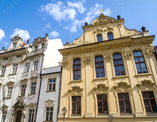 Two historic buildings in Prague, Czech Republic, showcasing intricate Baroque architecture, under a sunny sky.