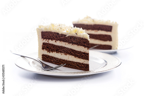 Two homemade cocoa sponge cakes with sugar mass on a plate with a fork on a white background.