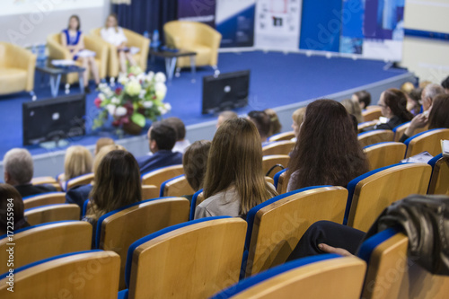 Two Hosts Giving a Talk at Business Conference in Congress Hall. Concepts of Business and Entrepreneurship.