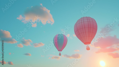Two hot air balloons fly at sunset over fluffy clouds; travel, adventure, freedom imagery