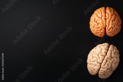 Two human brain models displayed against a dark background, highlighting different textures or colors, symbolizing brain function or anatomy.