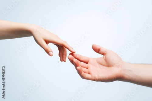 Two human hands reaching toward each other with fingers almost touching on a soft light background, symbolizing connection and trust.