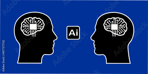 Two human heads with artificial intelligence circuits in their brains facing each other with ai symbol