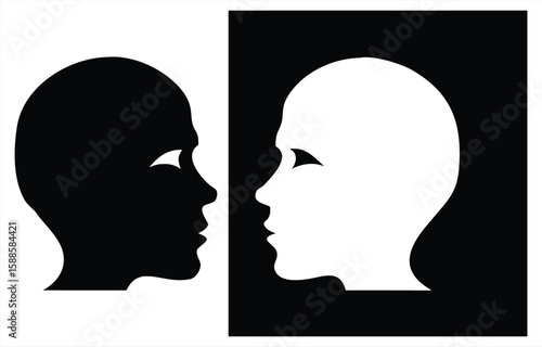 Two human profiles face each other, one in black silhouette against a white background and the other in white silhouette against a black background, symbolizing contrast and dialogue
