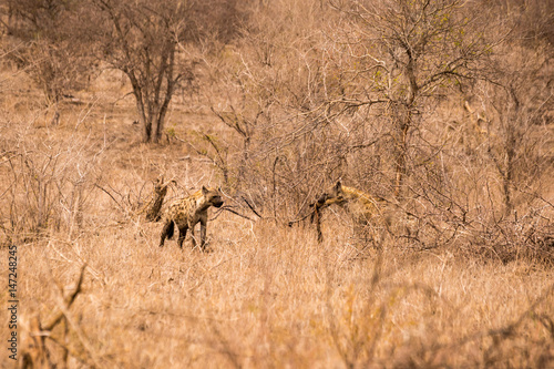 Two Hyenas with Prey in Savannah, Kruger Park, South Africa, Africa