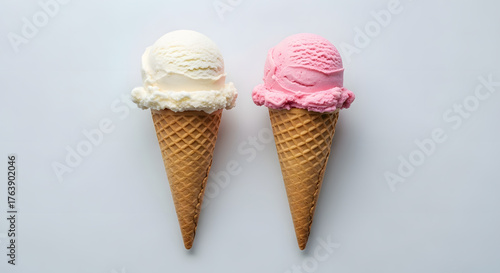 Two ice cream cones with vanilla and strawberry flavors