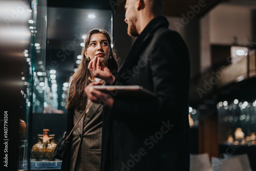 Two individuals engage in a focused conversation within a stylish and modern office environment. Concepts of teamwork, discussion, and productivity are exemplified in this corporate meeting scene.