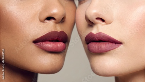 Two individuals with contrasting complexions wear the same shade of rich berry lipstick, captured in a tight shot focusing on the beauty product and varied skin tones.