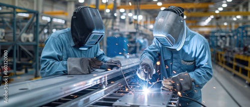 Two industrial workers wearing protective gear are welding metal parts in a modern factory setting.
