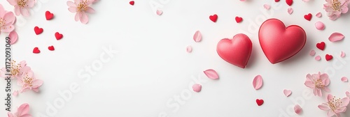 Two intertwined hearts rest on a white surface surrounded by delicate pink flowers, symbolizing love and affection for Valentine's Day.