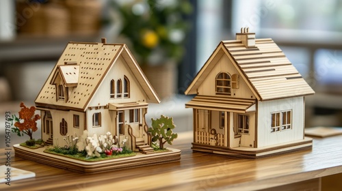 Two intricately designed wooden model houses displayed on a table.