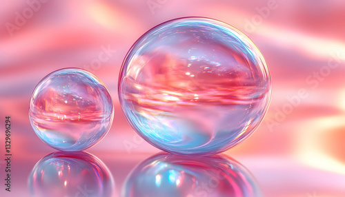 Two iridescent glass spheres rest on a reflective surface, mirroring a vibrant pink and orange backdrop. The smaller sphere sits beside the larger one
