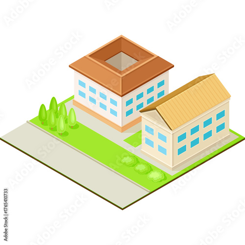 Two Isometric Buildings Surrounded by Greenery and a Paved Road in a Top Down View of an Urban Landscape