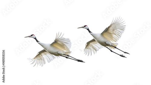 Two Japanese Red-Crowned Cranes in Flight Against Transparent Background