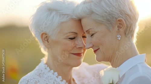 Two joyful elderly women embracing, silver-haired friends sharing a tender moment outdoors, warmth of friendship highlighted, copy-space available.