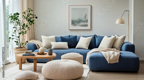 Two knitted poufs near dark blue corner sofa. Scandinavian home interior