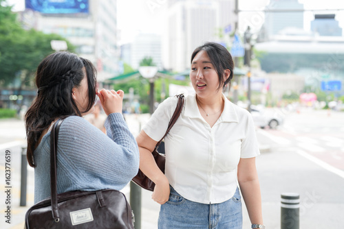 Two Korean women couple in their twenties in casual clothes stand by a crosswalk talking and laughing, expressions bright, as spring light brightens the busy boulevard. Seoul, Jung District, spring.