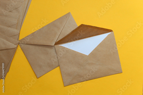 Two Kraft, brown envelopes lie on a yellow background.