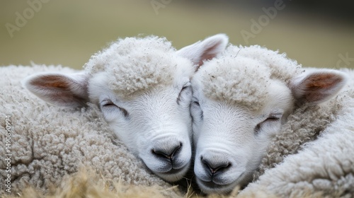 Two lambs cuddling together in a peaceful field