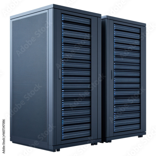 Two large, black server racks filled with multiple data storage units featuring blue indicator lights.