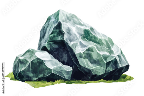 Two large, dark-green rocks rest on a patch of grass, rendered in a watercolor style. background removed