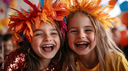 Two laughing girls with vibrant feathered hats embody joy and celebration, highlighting the spirit of friendship and shared happiness during a lively event or gathering.