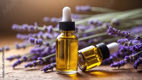Two lavender essential oil bottles with dropper caps placed on a rustic wooden surface surrounded by lavender flowers.