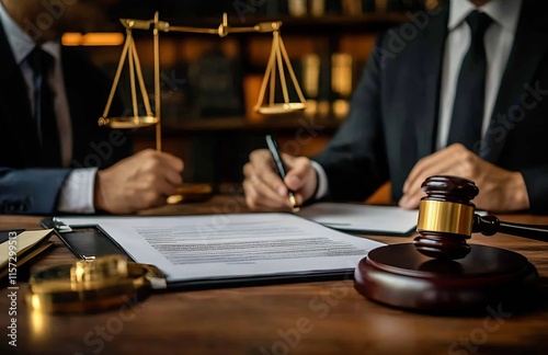Two Lawyers Discussing Legal Documents in Office with Gavel and Scales : Generative AI