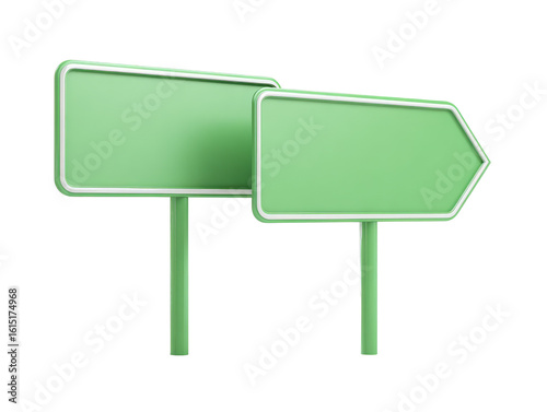 Two light mint green directional signs, one rectangular and one with an arrow, both mounted on simple light mint green poles