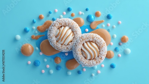 Two light-brown cookies with swirl cream filling, drizzled caramel, and colorful sprinkles on a light-blue background