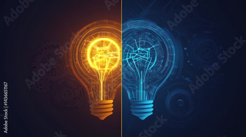 Two lightbulb halves, contrasting ideas, gears background, innovation concept