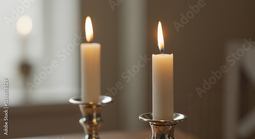 Two lit candles in silver holders on a table