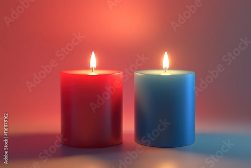 Two lit candles, one red and one blue, sit side by side against a soft, colored background.