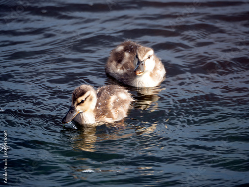 Two little ducklings are floating in the water.