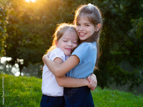 Two little girls friends in school uniform hug each other in the park.