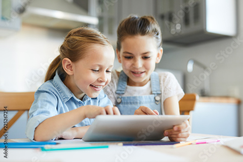 Two little girls having fun while watching curious vids or cartoons in touchpad in the kitchen