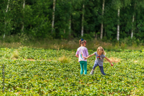 Two little girls picking fresh farm raspberries in field in Sevenoaks, Kent