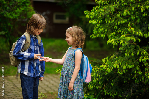 Two little school students, the boy and the girl, cheerfully communicate on the schoolyard.