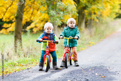 Two little sibling boys having fun on bikes in autumn forest.