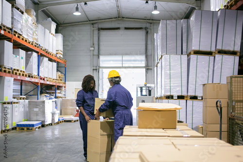 Two logistic workers in hardhat and overalls carrying boxes together in warehouse. Copy space, wide shot. Labor and production concept