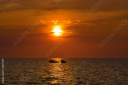Two Lonely ships on a wide sea during beautiful orange sunset in Asia