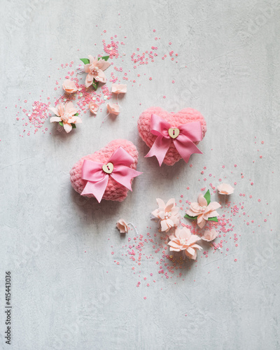 Two love knitted pink hearts on grey background, valentines day card concept