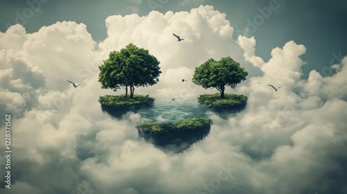 Two lush green trees on floating islands amidst fluffy clouds, birds in flight.