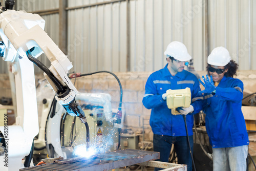 Two male and female engineer control robot arm welding at production line plant factory. Engineer workers working automatic robot arm system welding machine in the smart factory industrial